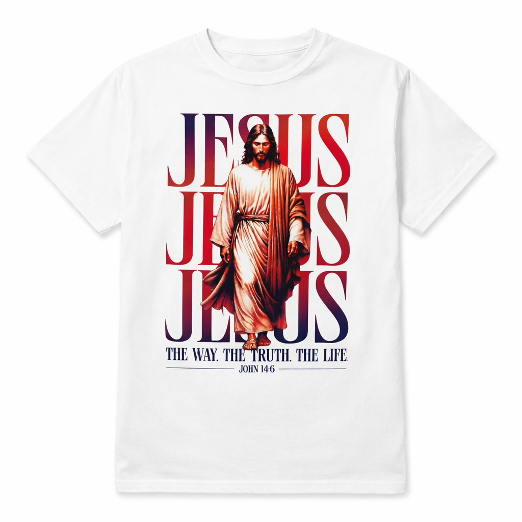 Make a bold statement of faith with this beautifully designed Jesus graphic T-shirt, featuring the powerful scripture John 14:6. Crafted on a crisp white tee, the artwork showcases Jesus walking forward with strength and grace, layered over a striking “JESUS” typography design. This shirt is perfect for everyday wear, church gatherings, or gifting.